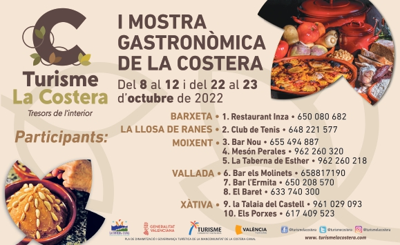 La mostra tindrà lloc del 8 al 12 i del 22 al 23 d’octubre a diferents pobles de la comarca L´objectiu és fomentar el turisme gastronòmic i el consum del productes agroalimentaris en el territori La Costera gaudeix d’una cultura