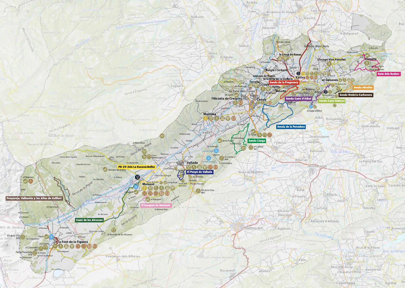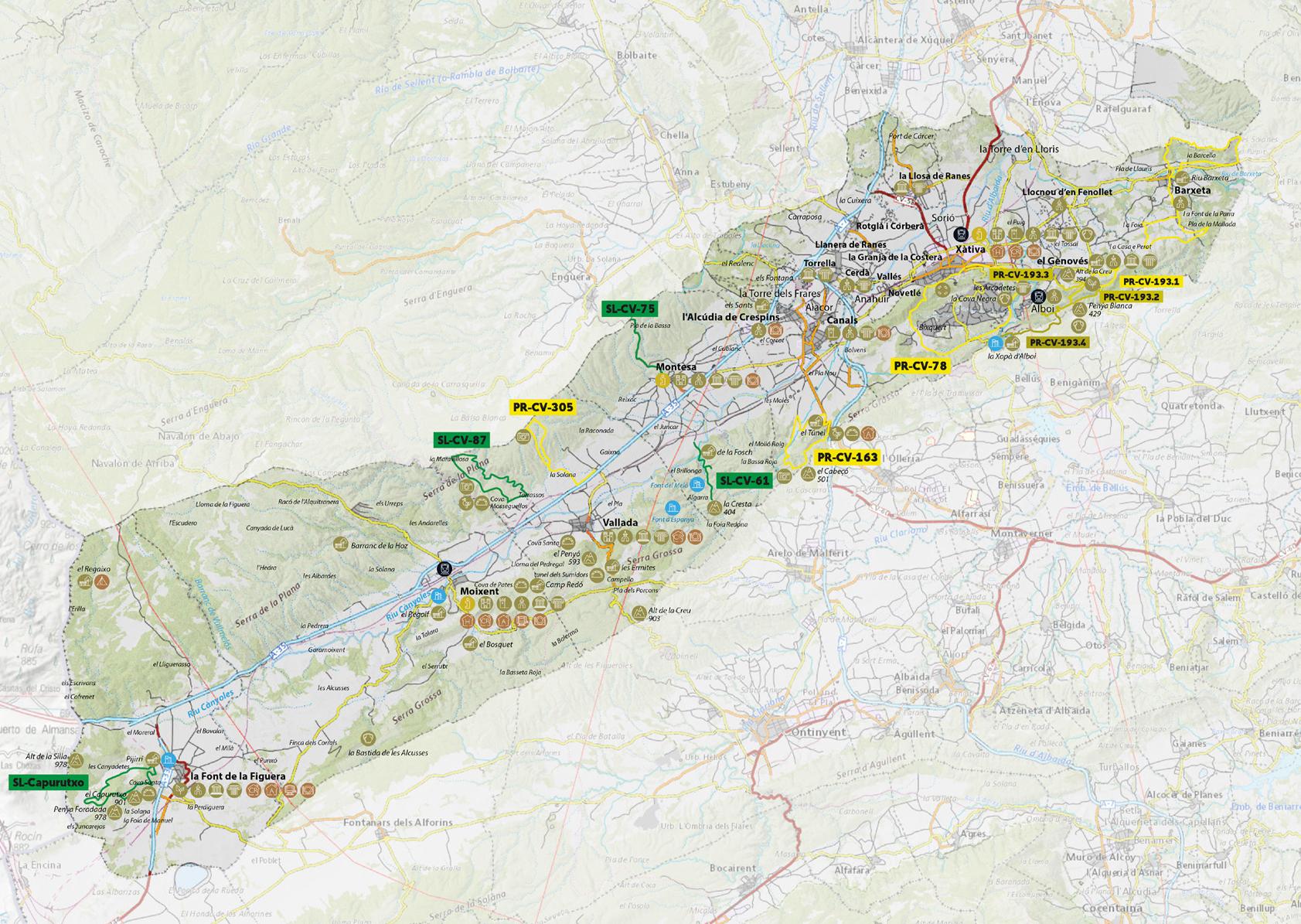 A selection of homologated short-distance trails, which will allow us to get to know and enjoy the diversity of landscapes and natural spaces in the region. La Costera is the only Valencian region in which the two most important mountain systems of the Mediterranean converge. The Betic system (the Serra Grossa) and the Iberian system (the massís del Caroig). Within this walled region extends the elongated valley through which the river Cànyoles runs and where its populations are located.